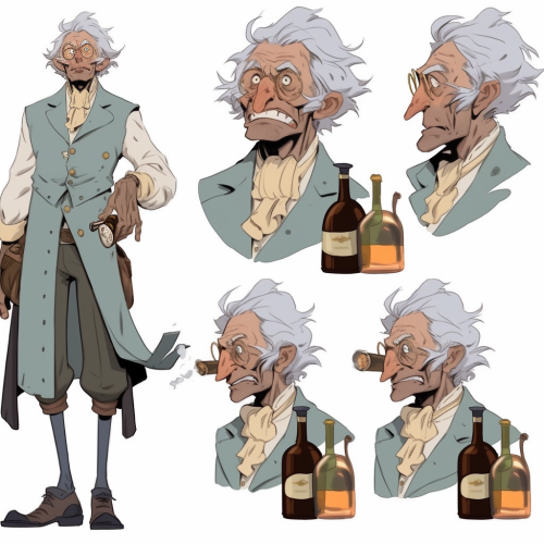 a character based on the real life man named Dr. Pierre Ordinaire, the French doctor living in Couvet, Switzerland, around 1792, he was involved with the creation of the drink absinthe, character sheet, multiple angles, triplets of belleville animation --niji 5