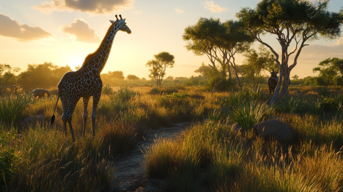 A wide shot of the African savannah with a tall, elegant giraffe named Zuma standing majestically among the grass and sparse trees. The background should have a bright, sunny sky and a few distant trees. --ar 16:9 --v 6.1