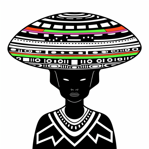 2d illustration of African Village Girl in African Clothing on the head in the shape of a UFO from the 80s , The optical illusion by person is displayed on a white wall, in the style of reductionist form, psychedelic artwork, thx sound, bold, black lines, # screenshotsaturday, positive/ negative space --s 50 --niji 5