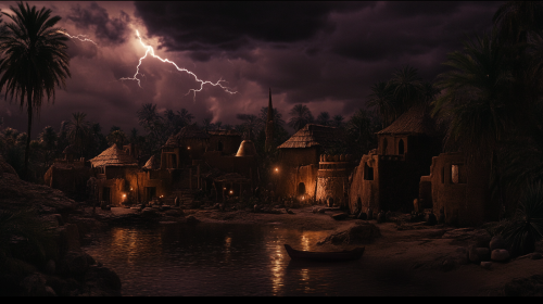 cinematic scene of a village around an oasis, it is dark with lightining flashes. This visual representation captures the essence of African mythology, This is an ultra-realistic photograph captured on high-resolution 35mm film. --ar 16:9