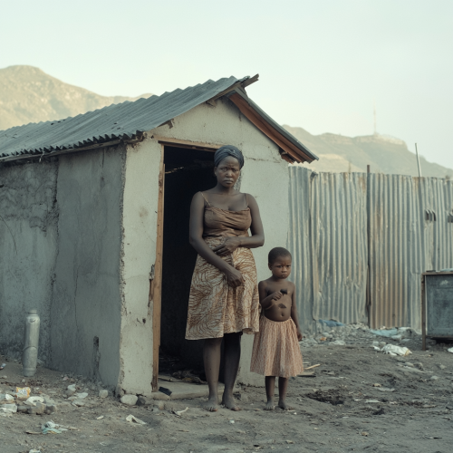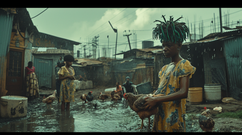 35mm cinematic film still of a futuristic science fiction village in africa in 2300, nigerian teenagers on a farm hunting chickens, neon hairstyles, wet nigerian lagos people, future technology, wires and tubes, african culture, african slums, filmed by [Denis Villeneuve], A cinematic moment captured on cinestill 50d film --ar 16:9 --style raw --v 6.0