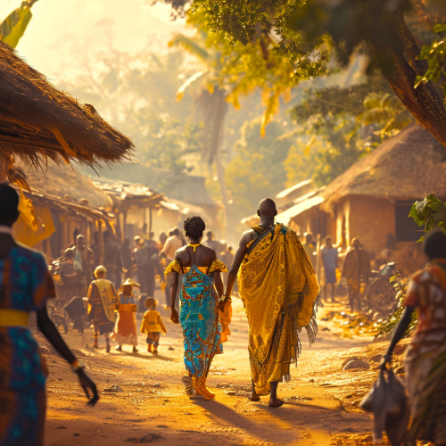8k, high resolution, spectacular quality, very detailed, vibrant colors, capturing a young african woman and her african husband dressed natively walking in the village centre surrounded by villagers, ethereal light, decadent atmosphere, dreaming inspired, intricate details --v 6.0