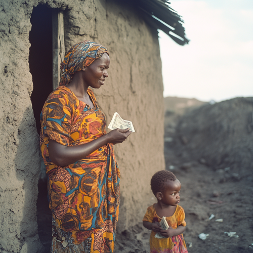 A dark-skinned African woman stands outside a simple hut her head wrapped with a colorful cloth in a dry, arid environment, her face illuminated with gratitude and a smile as she holds money in her hand, her deep skin glowing in the harsh sunlight, her equally dark-skinned young daughter clings to her leg, looking up with innocent eyes, the hut is made of cinder blocks, like most of the buildings around, with cinderblock walls connecting them, the roofs are made of sheet metal, reflecting the heat, yet the woman’s expression radiates deep appreciation and hope, the scene is stark but filled with quiet joy, as the money in her hand symbolizes a rare opportunity or blessing amidst the harsh conditions, 4k, hyperrealistic, photorealism, hyperrealism, photo taken with Sony a6300, 32k UHD, cinematic color grading --v 6.1