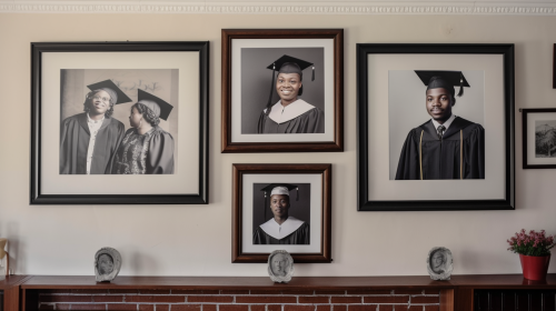 african boy graduation portrait photos hanging on wall in township family home, varsity bedroom, township house south africa, Daylight, clean aesthetic, fujifilm --ar 16:9 --v 5.0