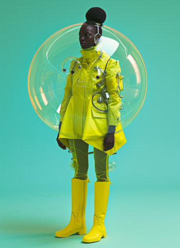 a woman standing inside of a glass bubble costume made of cranials, in the style of afrofuturism-inspired, soft color blending, futuristic contraptions, yellow and cyan --ar 61:84 --v 6.0