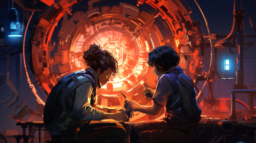 An afrofuturist concept sketch of engineers repairing alien technology outisde. In the style of studio ghibli and cyberpunk. Bright colors. --ar 16:9 --v 5.2 --seed 3208734512