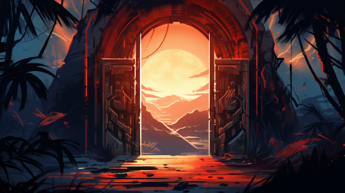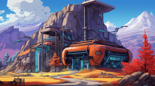 An afrofuturist concept sketch of alien door to facility in the mountains. In the style of studio ghibli and cyberpunk. Bright colors. --ar 16:9 --v 5.2 --seed 3208734512