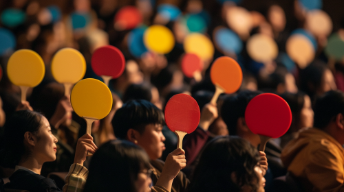an audience holding different colour small round ping pong paddles --ar 16:9