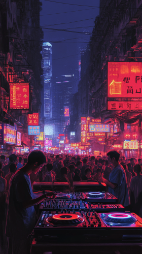 in a busy night of Hong Kong back in 1980s, 2 DJs playing music on the street with people partying and dancing in front of them. make the image vintage --ar 9:16 --v 6.1