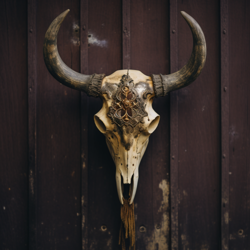 aged Cow skull decorated with embedded brass. Dismal. On barn wall