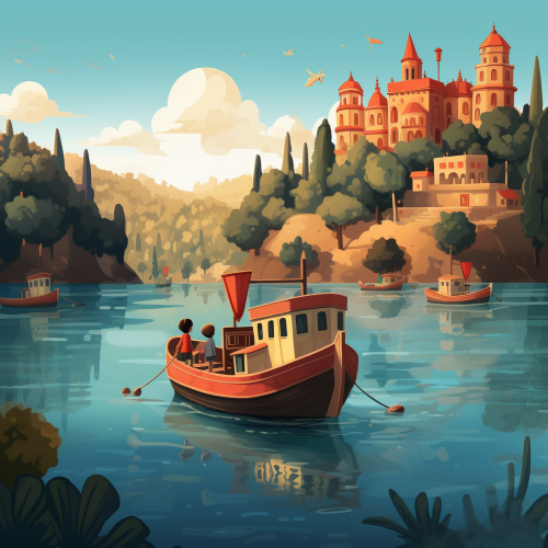 simple children’s book illustration of El Estero Lake paddle boats in the style of Nicholas Child