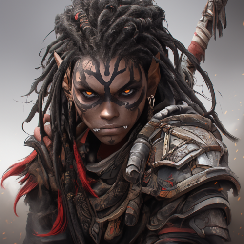 green skin orc girl ranger glowing black eye, claws and fangs, short hair, aggressive martial arts, with tattoos wearing a black and red armor against a black background. photorealistic oil painting, 8k resolution --niji 6 --p 4odw11f