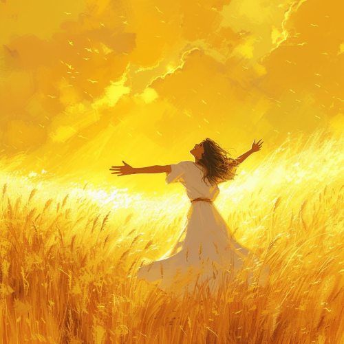 A girl in a sunlit golden field, arms wide open arms, face upturned, feeling the warmth of the sun, Naoko Takeuchi style --v 6.0