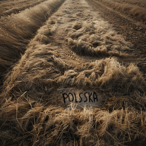 A genuine photo of a rye field seen from above, with the name "POLSKA" trampled into the crop. Realistic photos and real rye. True photo.
