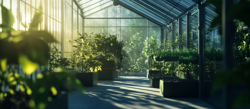 Indoor gardening equipment being used in a modern greenhouse; Current year; LED lighting; Painting --s 130 --v 5.1