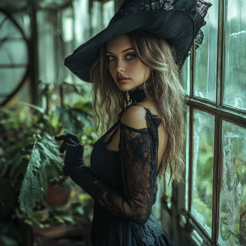a beautiful witch in the style of annie liebovitz leaning against a window looking into a greenhouse. Include a clear description, 3 style keywords, lens & camera details and post processing techniques.