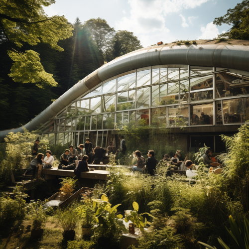an abandoned greenhouse in the style of Zaha Hadid architecture surrounded by Greenhills, people laughing and enjoying the view