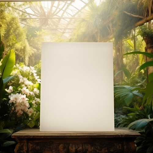 antique sheet of blank paper in historical greenhouse, floral background, bright natural lighting