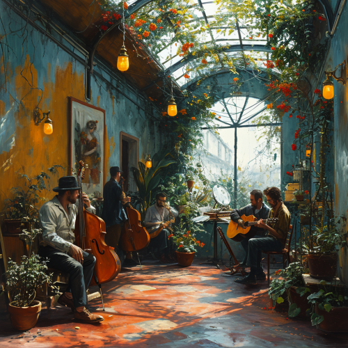 painting of a greenhouse cafe. People playing instruments. Coworking. Terracotta colors. In the stylof dino valls --s 750 --v 6.0