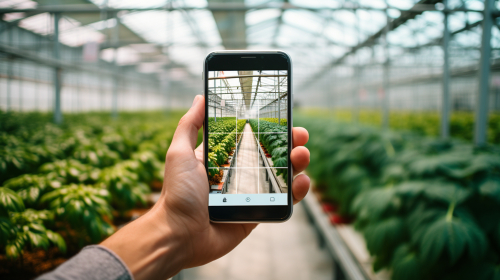 a hand holding a cellphone, the screen facing the camera, in a greenhouse --ar 16:9