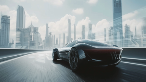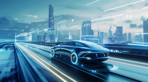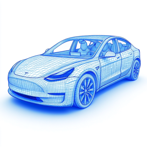 autonomous driving tesla, all radar, lidar and camera field of views are visible as cones, style modern ultra realistic, blue color style, Wireframe drawing, white background --v 6.1