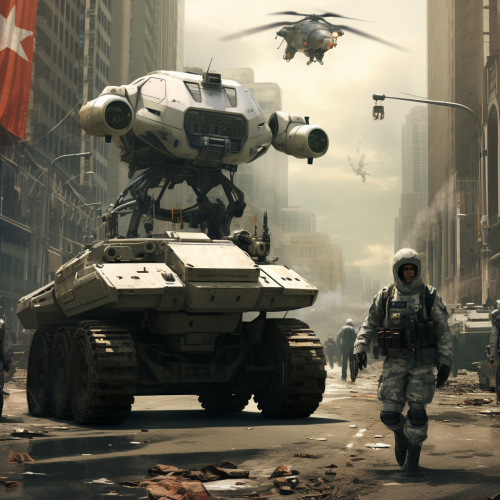 autonomous attacking vehicles used by American soldiers in a ground invasion. also put American soilder in the background with buildings.