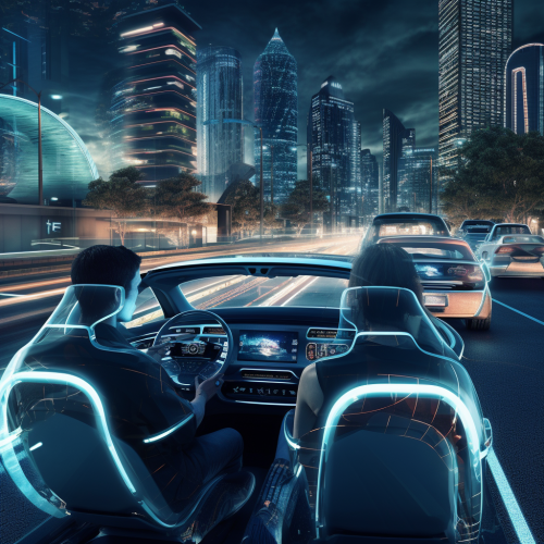 A man wearing an AR device sits in the driver's seat of an electric vehicle showroom, operating the car in autonomous driving mode without holding the steering wheel. On the wall in front of him, two projections appear: one shows a camping scene in the mountains, while the other displays the vehicle's automatic journey to a hospital, with a sub-screen illustrating the route map from the vehicle's current location to the hospital.