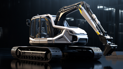 concept of a autonomous excavator by volvo in future city, black and white surfaces, front 3/4 view, high contrast, ultra realistic, uniform background --ar 16:9 --style raw