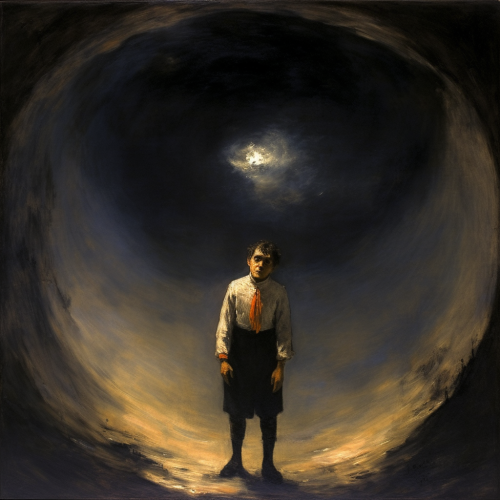 A figure stands with a visible hole in their chest, from which light emanates, symbolizing the deep exploration into the origin of emotions. Francisco Goya.
