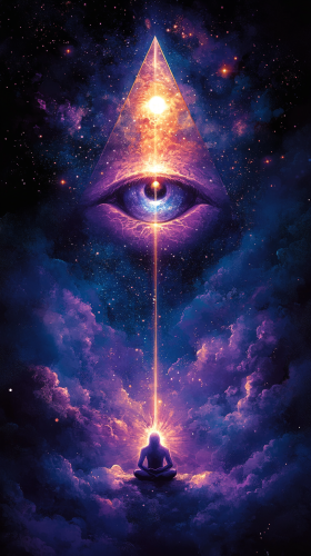 A glowing purple humanoid figure sits in a meditative posture under a massive, ethereal all-seeing eye in the sky. The all-seeing eye radiates cosmic energy, and a bright beam of light descends from the eye, connecting directly to the figure below. On one side of the eye, the sun shines with golden rays, while on the other side, the moon emits a soft, silvery glow. Stars twinkle around the eye, creating a celestial atmosphere. The glowing figure is bathed in the beam of light, symbolizing divine connection and enlightenment. The background is a dark, starry expanse, filled with swirling cosmic energy and mystical patterns, enhancing the spiritual and powerful ambiance of the scene. --ar 9:16 --s 750