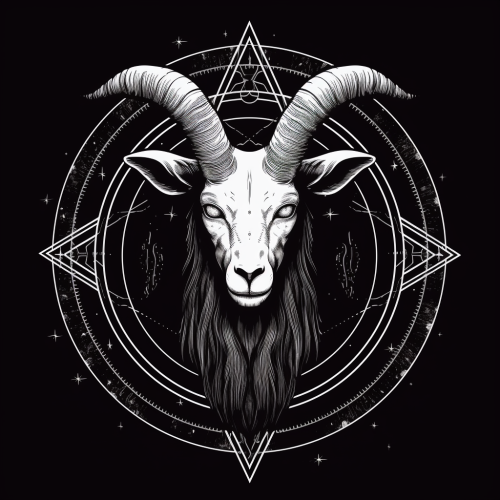 bloodthirsty satanic goat with pentagram on forehead, simple black and white drawing, flat black background with black magic symbols