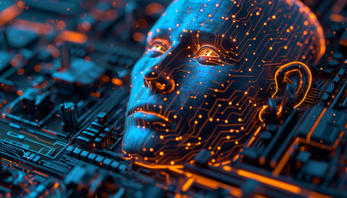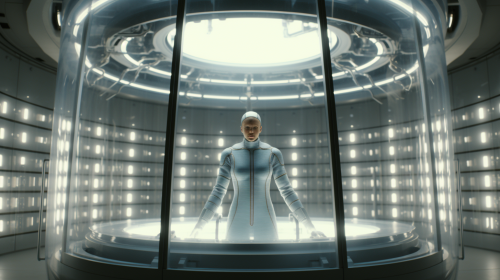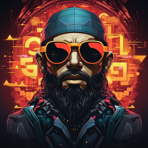 Create a surreal portrait of a figure with an iridescent, futuristic appearance, bathed in vibrant neon colors. Utilize intricate cross-hatching to add depth to the figure's metallic skin texture and unique contour. The character should possess a minimalist expression, reflecting a sense of detachment and mystery, as if from another world. Render the background with minimal detail, focusing on empty spaces to emphasize an eerie, isolated ambiance. Include a subtle, symbolic motif, like a small glint or abstract pattern, to enhance the mystical feel and hint at deeper layers within the figure’s identity.
