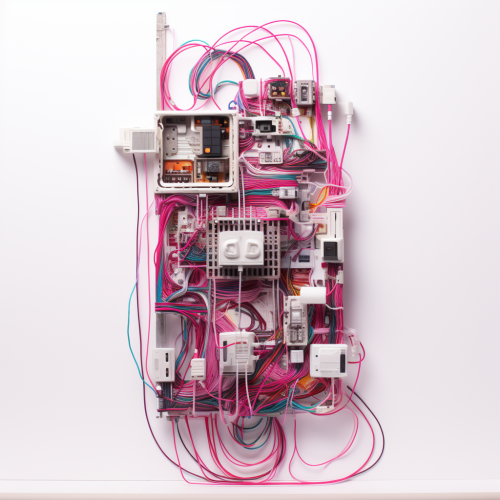 iPhone standing vertically, connected to wires leading to a switch board, magenta wires, white background