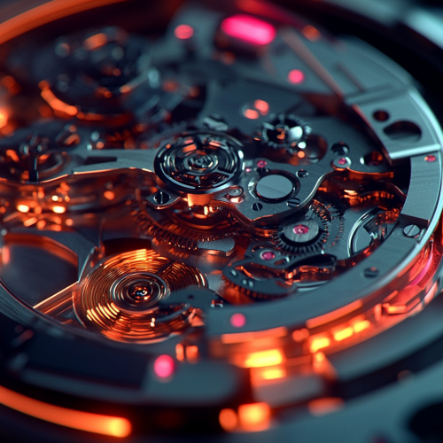 techy technical and beautifully engineered watch design internal parts, a high end watch with internal technical looking parts with thin high tech lighting