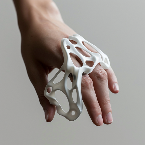 an ultra minimal and lightweight bio assistive medical device made for ones hand and all five fingers to assist in opening. 3-D printed from laser scans of the patient's hand. Ultra low profile design should follow cartier in design style. Show being worn by patients in a lifestyle prescription pharmaceutical style advertising.
