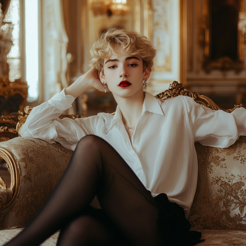 In the photo, a beautiful 16-year-old man with short blond curls, earrings in his ears, with lipstick on his lips in a white blouse, in dark, transparent tights and in dark high heels sits on a sofa against the background of a hall in a palace