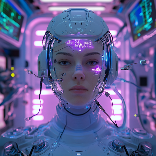 Chris Brown in grey blue spacesuit examining a data panel window in a starship corridor, Sci-Fi, colour, sci-fi, alien, lost in space, cinematic style,epic, details, colour, felt-tip pen --ar 16:9 --s 750 --v 5.2