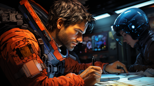 harrison ford in grey blue spacesuit examining a data panel window in a starship corridor, Sci-Fi, colour, sci-fi, alien, lost in space, cinematic style,epic, details, colour, felt-tip pen --ar 16:9