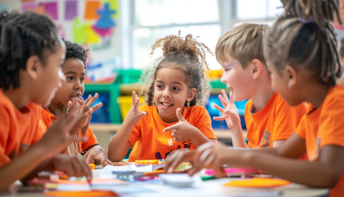 a lively classroom setting in a K-12 education context, where young deaf students, elementary-aged, are engaged in a hands-on learning activity. They are using American Sign Language, showing hand signs part of ASL. The children are seated around a table, interacting with various educational tools or manipulatives. Their bright orange shirts suggest that they may be part of a themed activity or a specific group within the classroom. There are colorful educational materials leaning against the wall behind them. Shot with a Nikon AF-S DX Nikkor 35mm f/1.8g lens, lit by daylight, photo --v 6.0 --ar 7:4