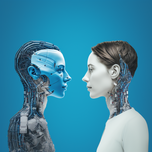 Design a promotional image for education and training in the AI era with a blue background. It is divided into two parts: left and right. It should be concise and do not contain text, but leave a blank space for text.--ar 430:300