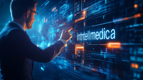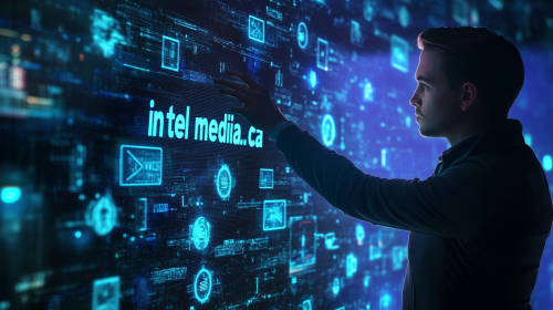 Businessman touching a digital screen with the word " intelmedia.ca " on a virtual transparent background, a business technology concept. Side view. Double exposure effect. --ar 16:9