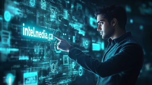 indian Businessman touching a digital screen with the word " intelmedia.ca " on a virtual transparent background, a business technology concept. Side view. Double exposure effect.neon blue green glow, --ar 16:9
