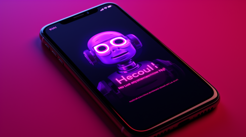 an iPhone screen showing a chatbot saying "hello! how can I help you" on the screen. magenta color scheme. bright magenta solid background without shadows. hd. 4k --ar 16:9