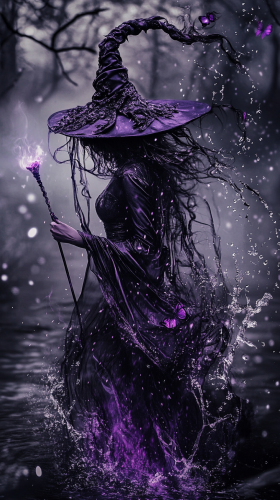 a witch rising from a puple and white lake holding a wand with the water falling over her clothes. HD photo. --ar 9:16 --v 6.1 --style raw --p jfn2emg