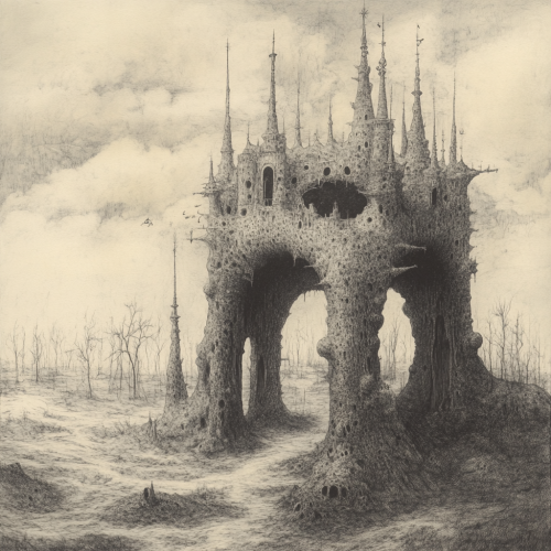 Illustrate a surreal landscape in the style of Edward Gorey, depicting a mysterious organic structure with spiked, jagged towers rising from a misty meadow. Use intricate cross-hatching to bring out the rough, textured surfaces of the structure, capturing the eerie blend of nature and architecture. The interior of the hollow center should appear dimly lit, with strange archways leading to unknown chambers, evoking curiosity and subtle unease. Keep the landscape minimal yet atmospheric, using fog and shadow to emphasize isolation and mystery. Incorporate symbolic elements subtly, such as a faint silhouette of a bird in flight or a lone tree in the background, hinting at hidden stories or emotions. Maintain a whimsical but melancholic tone, blending detailed textures with empty spaces to reflect Gorey’s signature aesthetic of haunting stillness.