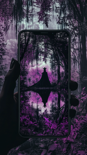 imagine you are taking a selfie but you are looking at you own image on the phone. The photo shot is taken from behind you so you can see your own image. That image ia a witch rising from a purple and white lake. Hd photo. --ar 9:16 --v 6.1 --style raw --p jfn2emg