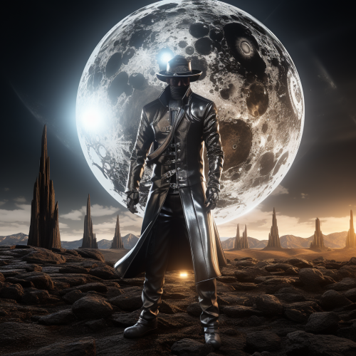 A clockwork man wearing a derby hat and a reflective silver jacket, standing in front of a rising moon, a large rising moon on the horizon behind the clockwork man wearing a derby hat and a reflective chrome jacket, high contrast, dramatic cinematic lighting, extremely detailed, unreal engine, insanely detailed, photorealistc, 4k, HD