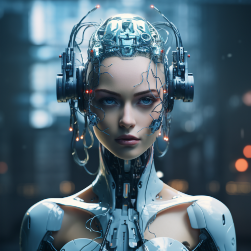 female artificial intelligence robot, cyberpunk style with head wired to a steal cap, make it realistic