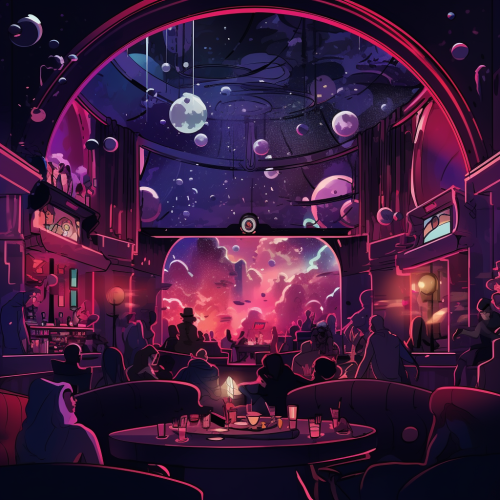 luxury club in cartoon with a dj in the far back, interior photo, vibrant colors