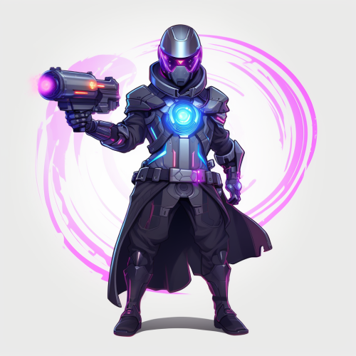 full body shot of an animated character in the style of valorant illustrations, holding a laser cannon aimed at the camera, the character has a glass holographic display unit covering one eye, transparent background
